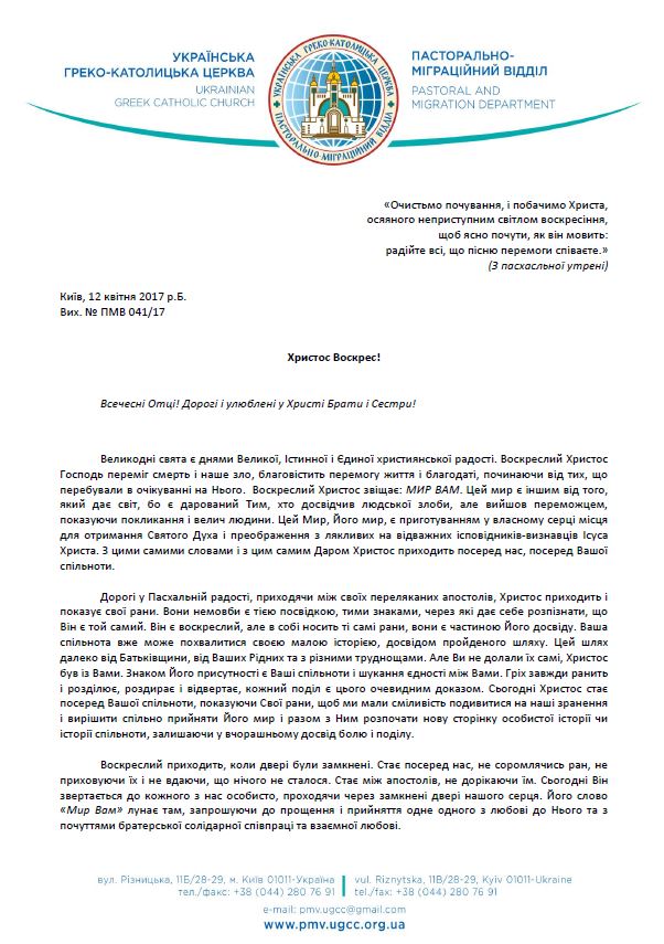 Великодні свята є днями Великої, Істинної і Єдиної християнської радості. Воскреслий Христос Господь переміг смерть і наше зло, благовістить перемогу життя і благодаті, починаючи від тих, що перебували в очікуванні на Нього. Воскреслий Христос звіщає: МИР ВАМ. Цей мир є іншим від того, який дає світ, бо є дарований Тим, хто досвідчив людської злоби, але вийшов переможцем, показуючи покликання і велич людини. Цей Мир, Його мир, є приготуванням у власному серці місця для отримання Святого Духа і преображення з лякливих на відважних ісповідників-визнавців Ісуса Христа. З цими самими словами і з цим самим Даром Христос приходить посеред нас, посеред Вашої спільноти.