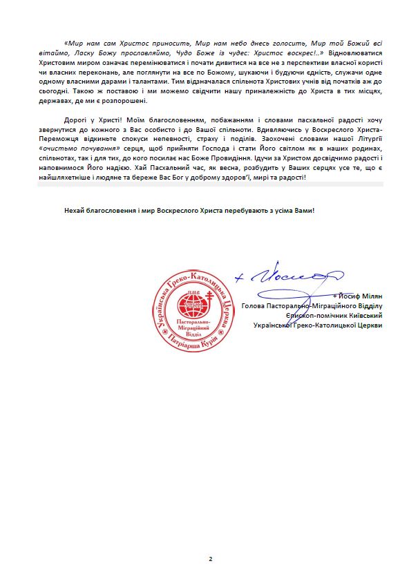 Дорогі у Христі! Моїм благословенням, побажанням і словами пасхальної радості хочу звернутися до кожного з Вас особисто і до Вашої спільноти. Вдивляючись у Воскреслого Христа-Переможця відкиньте спокуси непевності, страху і поділів. Заохочені словами нашої Літургії «очистьмо почування» серця, щоб прийняти Господа і стати Його світлом як в наших родинах, спільнотах, так і для тих, до кого посилає нас Боже Провидіння. Ідучи за Христом досвідчимо радості і наповнимося Його надією. Хай Пасхальний час, як весна, розбудить у Ваших серцях усе те, що є найшляхетніше і людяне та береже Вас Бог у доброму здоров’ї, мирі та радості!