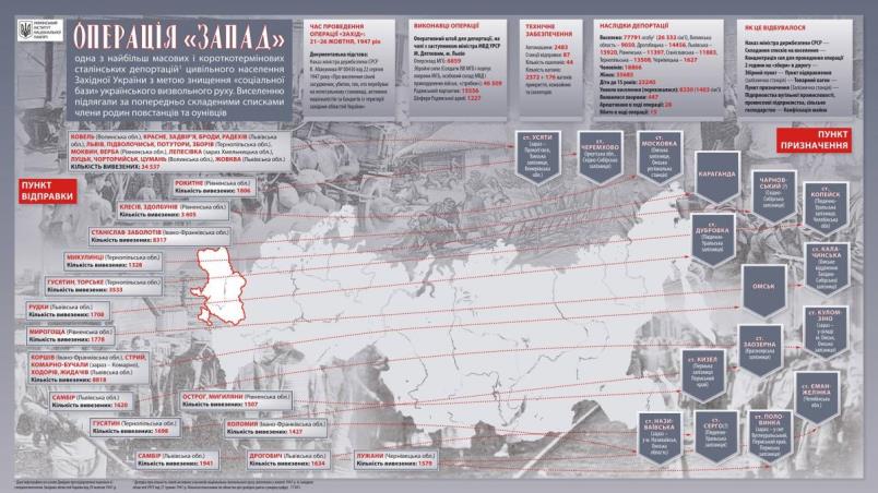«Операція «Запад» стала однією з наймасовіших депортацій українців організованою комуністичним режимом. За своїм масштабом вона є злочином співмірним із депортаціями кримських татар у 1944 році чи виселенням українців у рамках акції «Вісла», організованою польською комуністичною владою», - зазначив Голова Українського інституту національної пам’яті Володимир В'ятрович.