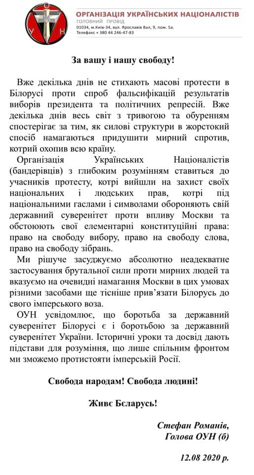 ОУН усвідомлює, що боротьба за державний суверенітет Білорусі є і боротьбою за державний суверенітет України. Історичні уроки та досвід дають підстави для розуміння, що лише спільним фронтом ми зможемо протистояти імперській Росії.