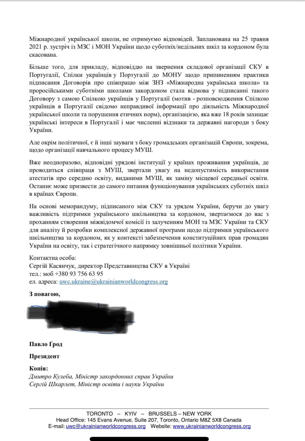 На основі меморандуму, підписаного між СКУ та урядом України, беручи до увагу важливість підтримки українського шкільництва за кордоном, звертаємося до вас з проханням створення міжвідомчої комісії із залученням МОН та МЗС України та СКУ для аналізу й розробки комплексної державної програми щодо підтримки українського шкільництва за кордоном, як у контексті забезпечення конституційних прав громадян України на освіту, так і стратегічного напрямку зовнішньої політики України.