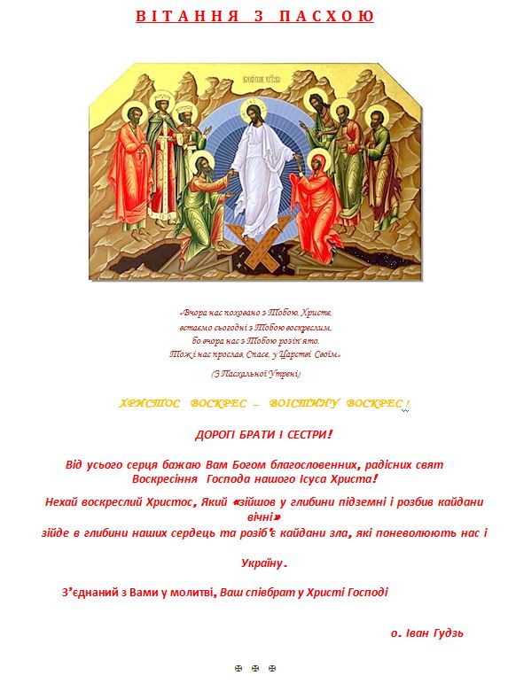 Від усього серця бажаю Вам Богом благословенних, радісних свят Воскресіння Господа нашого Ісуса Христа!