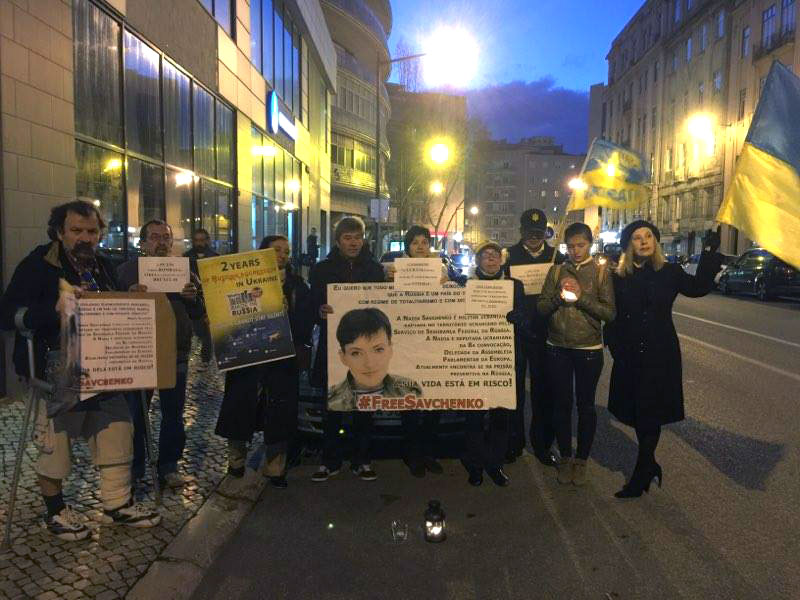 Сьогодні, 20 березня, українці у Лісабоні продовжили безстрокову акцію підтримки Надії Савченко, біля російського посольства. Акція розпочалася 8 березня і триває щоденно з 19:00 до 20:00 год.