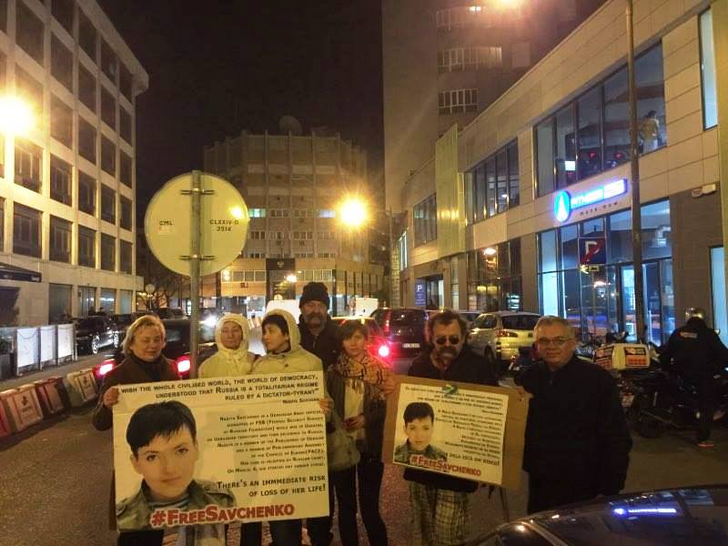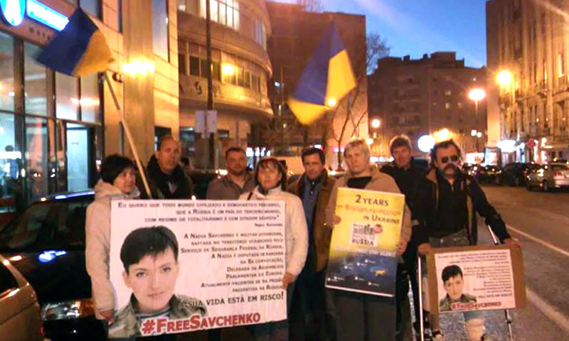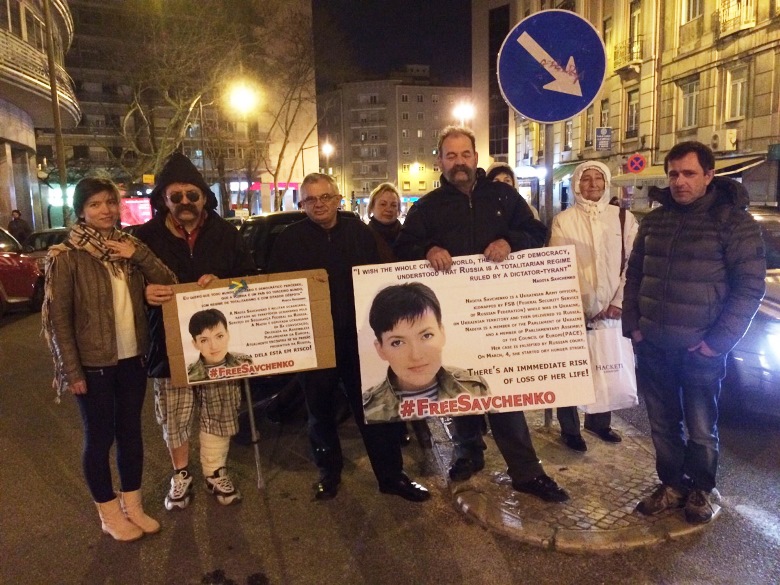 Сьогодні, 14 березня у Лісабоні, українці продовжили безстрокову акцію підтримки Надії Савченко, біля російського посольства, приєдналися до акції і наші друзі з Грузії.