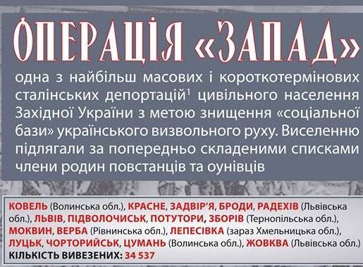 Операція «Запад» – одна з наймасовіших і короткотермінових сталінських депортацій цивільного населення Західної України з метою знищення «соціальної бази» українського визвольного руху. Виселенню підлягали за попередньо