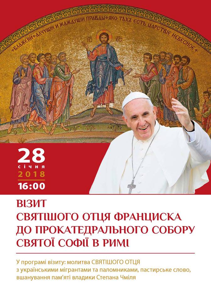 28 січня 2018 р. Святіший Отець Франциск відвідає прокатедральний собор Святої Софії в Римі та зустрінеться з українськими мігрантами в Італії. Візит Понтифіка відбудеться на запрошення Блаженнішого Святослава, Глави і Отця УГКЦ.