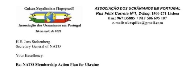 Користуючись нагодою перебування в Португалії головного секретаря НАТО Єнса Стотенберга Спілка українців у Португалії, як складова організація Світового Конгресу Українців звернулася до пана Єнса з листом щодо прискорення роботи з надання Плану дій