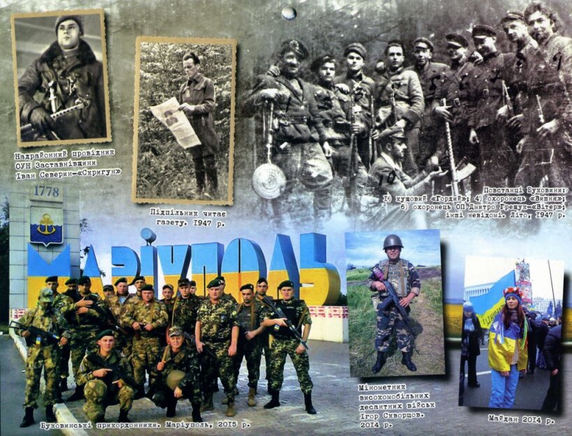 А ось ілюстративна частина поєднує чорно-білі світлини УПА з кольоровими фотографіями наших воїнів-героїв, котрі захищають рідну землю перед черговою навалою зі Сходу вже нині в Луганській та Донецькій областях. Компонування фотосюжетів, на мою думку, вийшло таким вдалим, що, здається, упівці вітаються «Слава Україні!», а воїни ЗСУ – їхні внуки і правнуки відповідають «Героям слава!» Справжня, не вигадана, естафета поколінь!